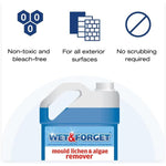 The Wet & Forget Mould, Lichen & Algae Remover is designed to effortlessly remove mould, lichen, algae, and moss—from surfaces like patios, fences, roofs, and decking. It is built on a bleach-free, non-toxic formula offering a comprehensive outdoor cleaning solution.